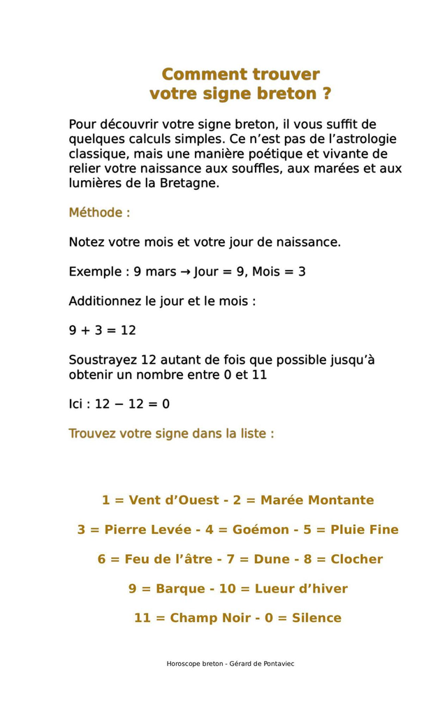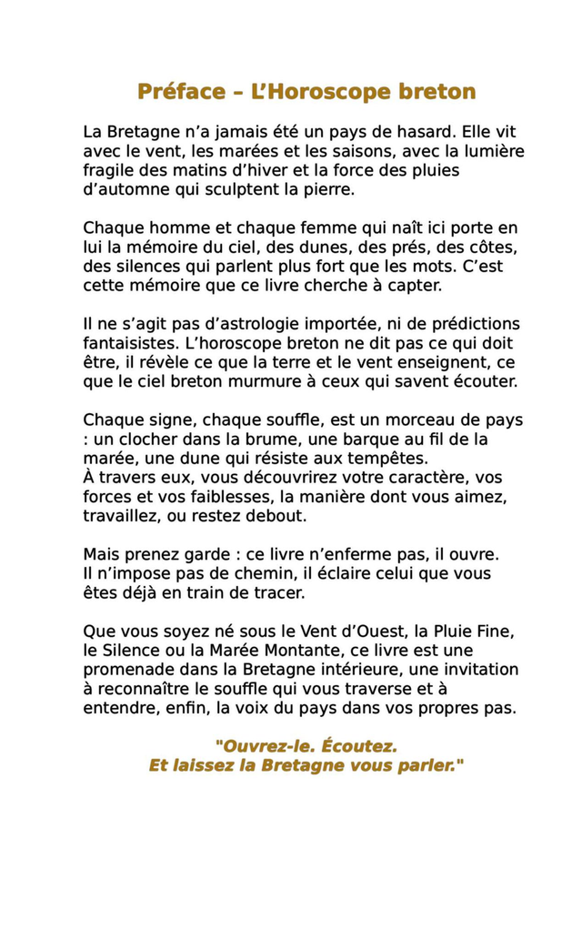 Plongez au cœur des traditions celtiques avec L’Horoscope des Signes Bretons, un ouvrage unique qui révèle une autre manière de lire le ciel et le caractère humain. Inspiré des mythes, de la nature et des symboles ancestraux bretons, ce livre vous invite à découvrir votre signe breton, sa signification profonde et les influences qui façonnent votre tempérament, vos forces et vos chemins de vie. À l’intérieur de cet ouvrage en couleurs :